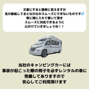 当社のキャンピングカーは全ての車両に事故対応マニュアルを常設しておりますので、万が一の場合も安心!!