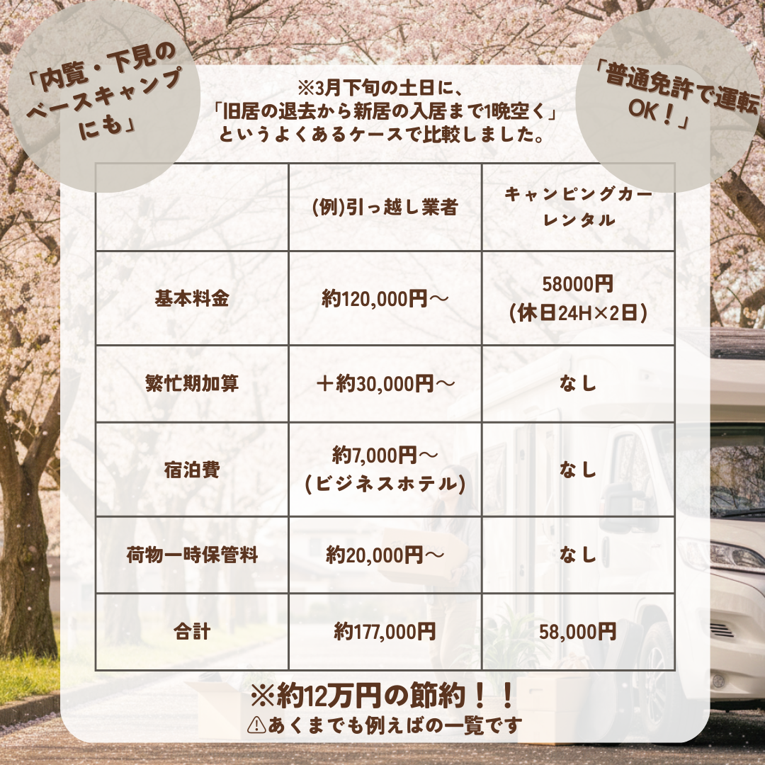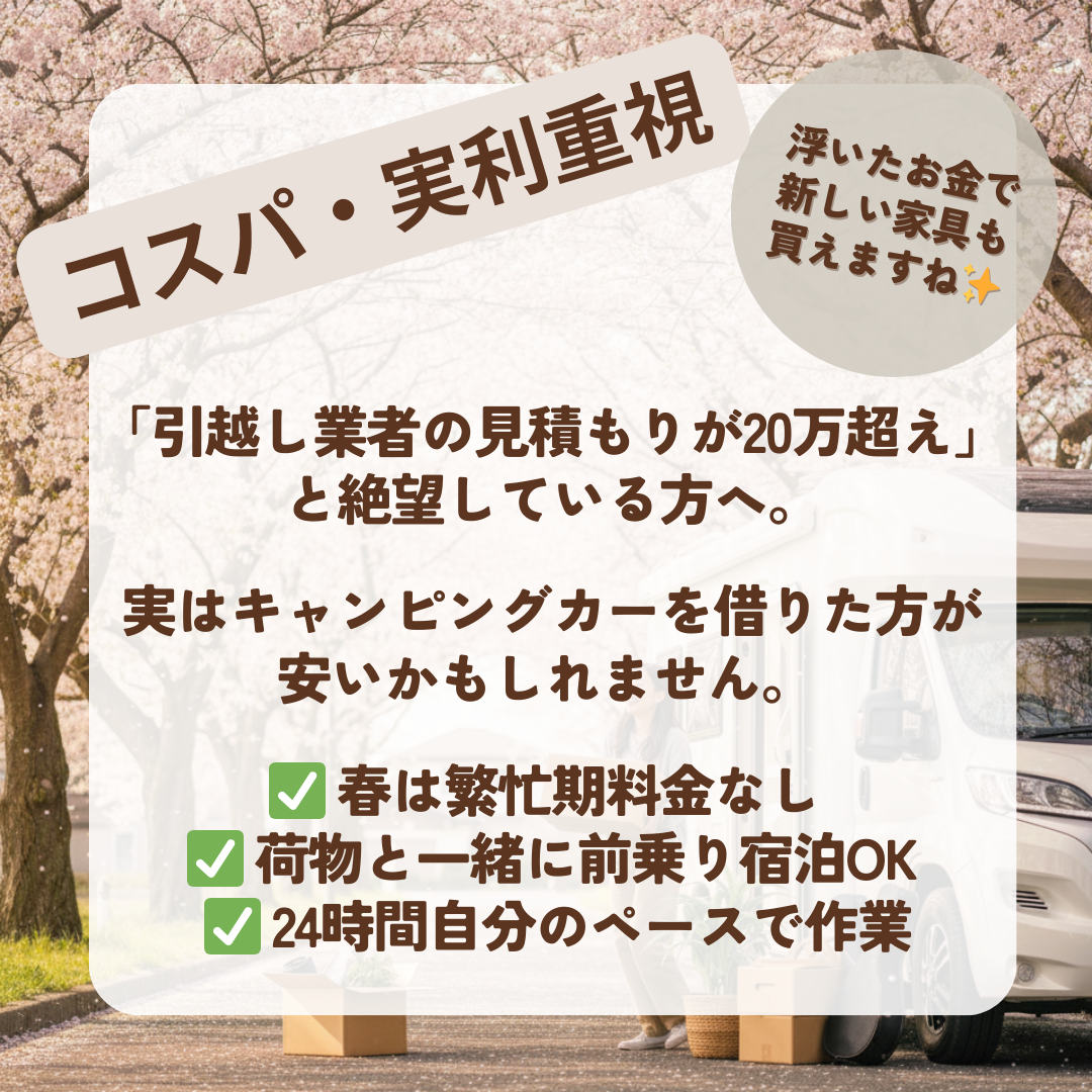 新しい門出にキャンピングカーでお引越しも視野に入れて置いて頂けると、引っ越し難民にならずに済むかと思います🥰